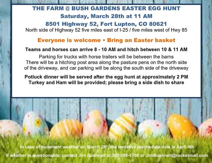 CDHA member Jim Bushnell is hosting an Easter Egg Hunt at The Farm @ Bush Gardens, and everyone is welcome to come enjoy a fun day with horses, friends, and family!